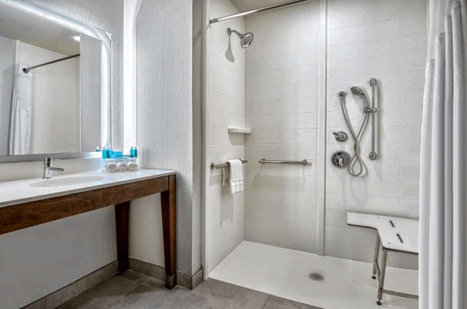 2 Queen Beds Suite Comm Accessible Tub is 301 square feet and includes 2 queen-size beds 150-154 width plus hairdryer, tea and coffee making facilities , and safe.